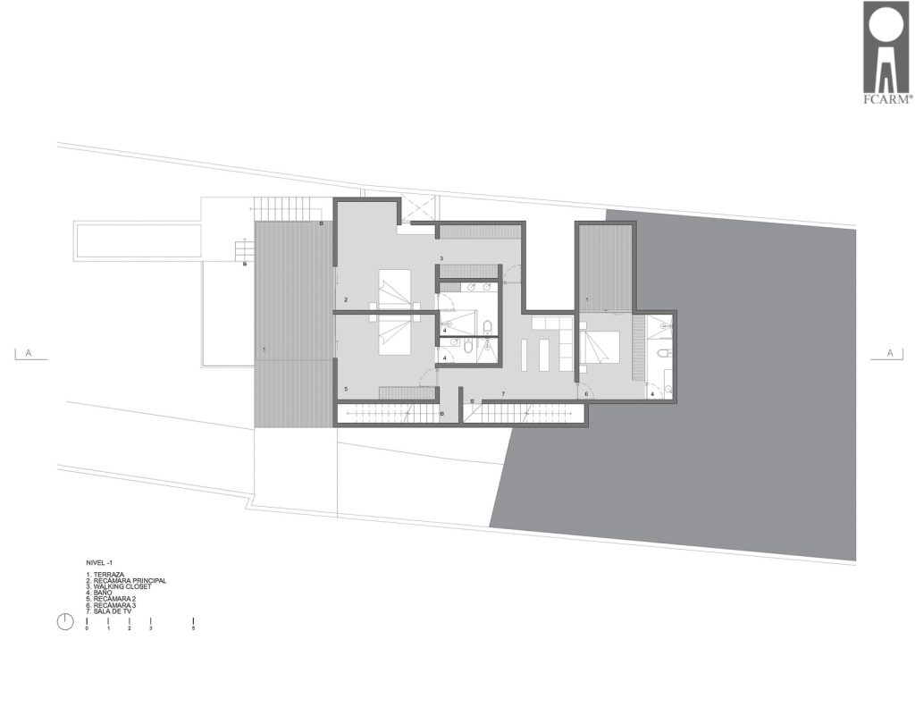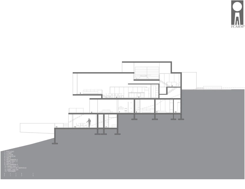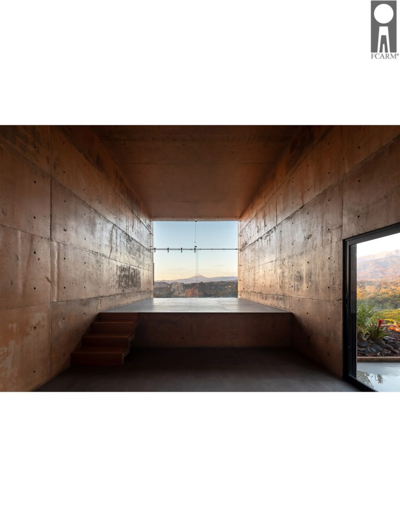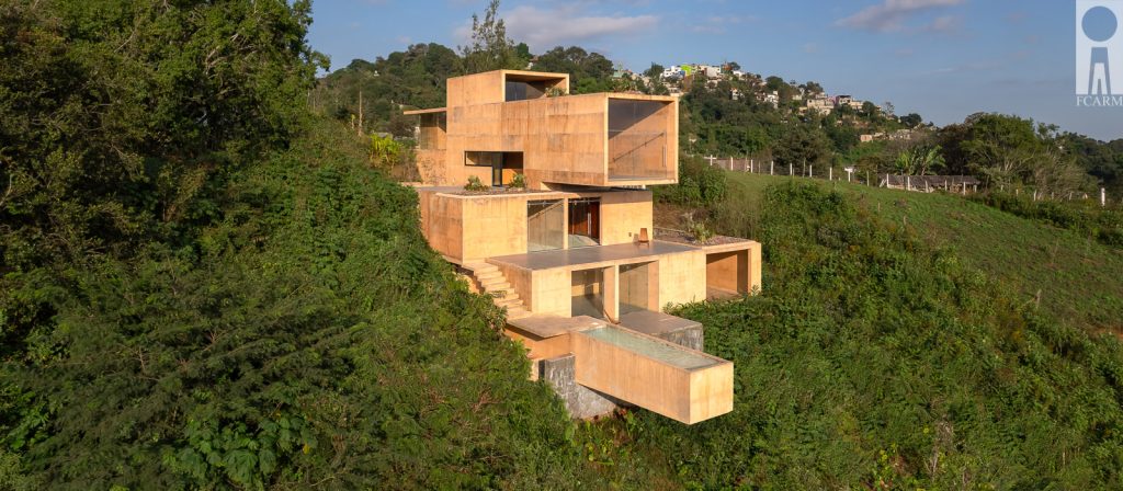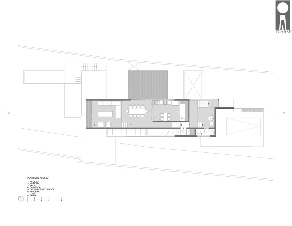 El acceso a la casa está planteado bajo esta misma premisa de ocultarse, es un juego de volúmenes que apenas se asoman y en contraste la fachada posterior se abre distribuyendo el programa arquitectónico de manera escalonada aprovechando su topografía alineada al eje rector del proyecto.