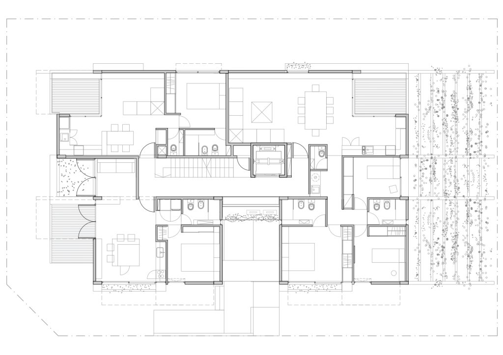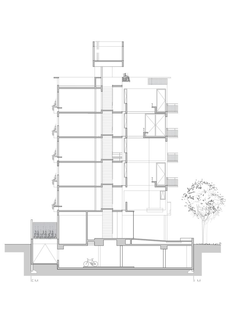 Utilizando las expansiones como herramienta no sólo funcional sino también morfológica, un sistema alternante de hormigón visto crea diferentes tipologías en cada piso, siendo la diversidad no sólo formal sino también programática, promoviendo diversos y flexibles modos de habitar. Dentro del sistema tridimensional se creó un módulo de ajuste que fluctúa la superficie interior en relación con la cantidad de habitantes, volviendo cada tipología única en el conjunto. Las nombramos según los “Árboles de Buenos Aires” de la autora argentina Silvina Ocampo por quien el proyecto lleva nombre.