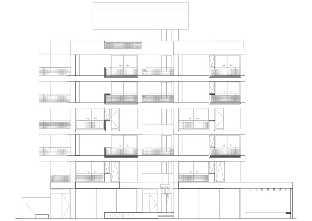 En un lote en esquina del conurbano bonaerense, área suburbana de Argentina, está ubicado Ocampo, edificio de viviendas y equipamiento urbano. Su entorno presenta múltiples proyectos de vivienda multifamiliar en vías de construcción dando respuesta al nuevo código de planeamiento que prevé una mayor densidad para la zona. Entendiendo que esta densificación llevará años, y mientras tanto, el proyecto deberá convivir con casas bajas de patio y jardín, propusimos un edificio sin espaldas, que principalmente tome la esquina, que no la niegue, que rote, que se valga de sus cuatro orientaciones libres y, por tanto, disponga de todo el cambio del día y el entorno a través de sus vanos.