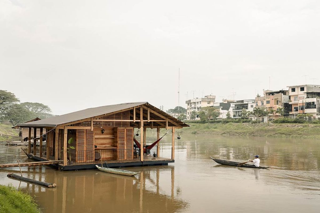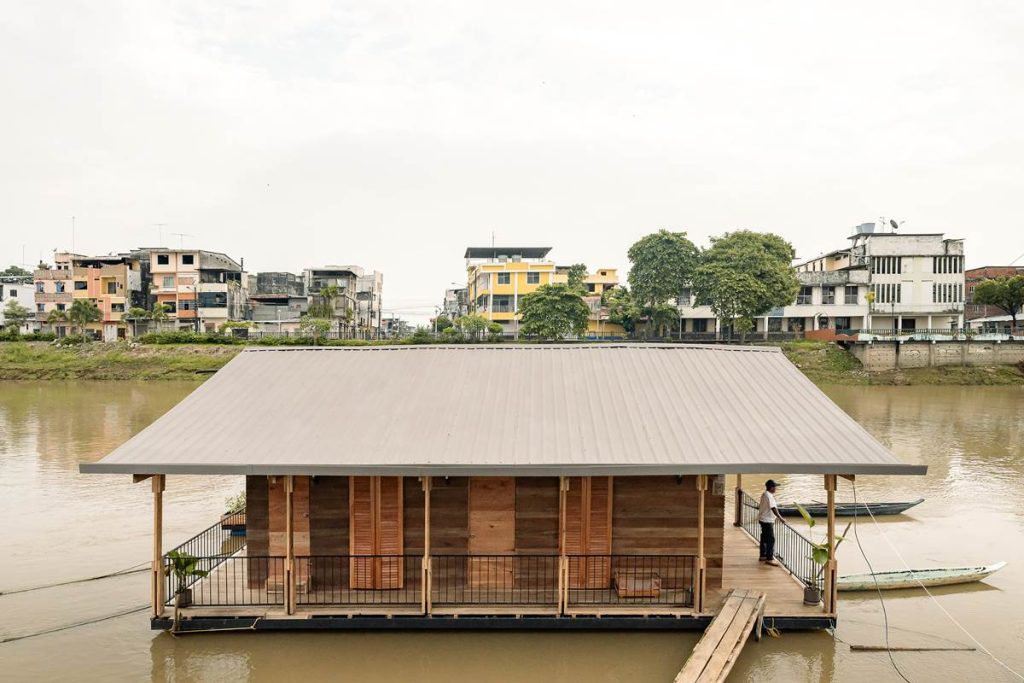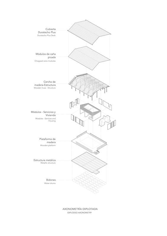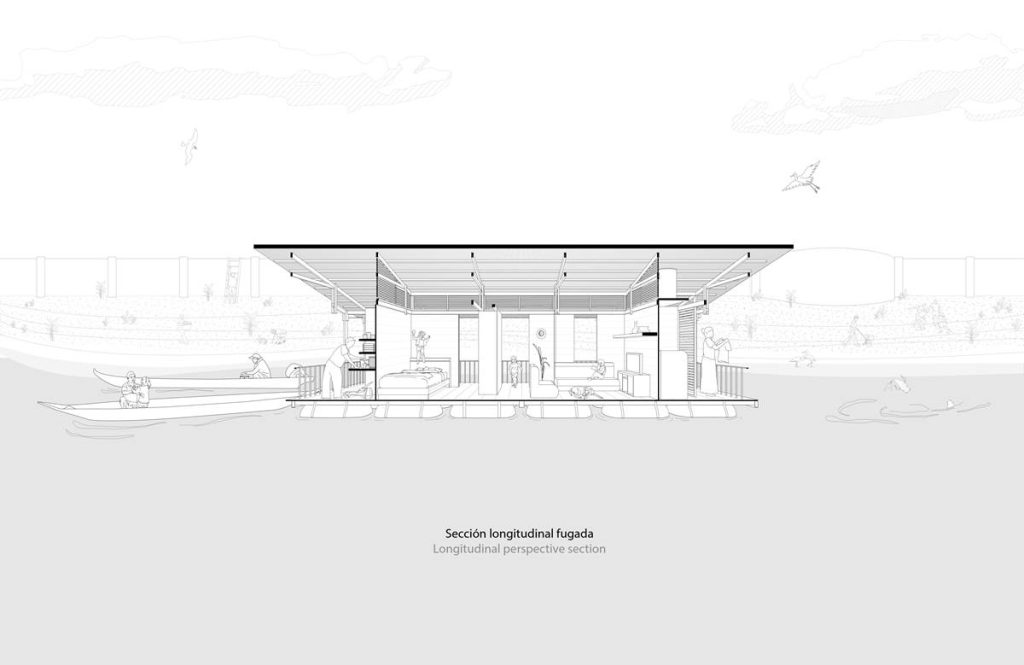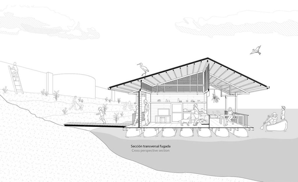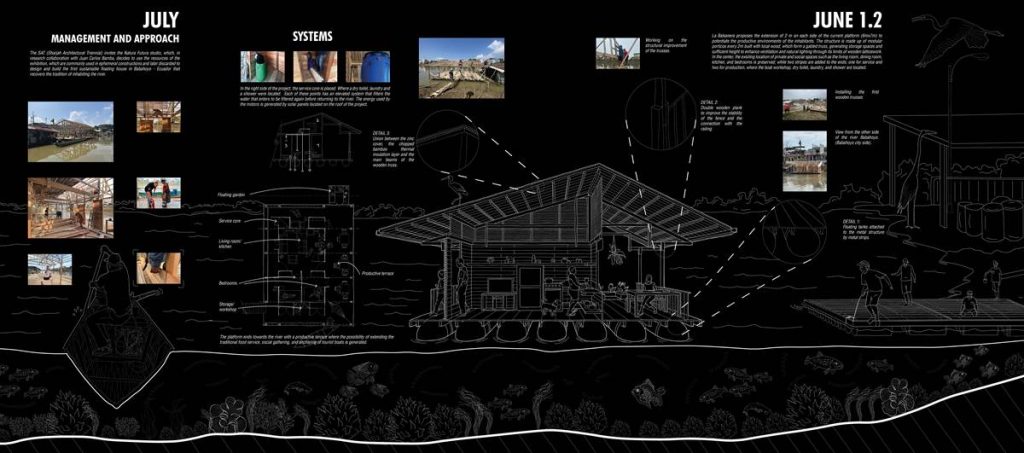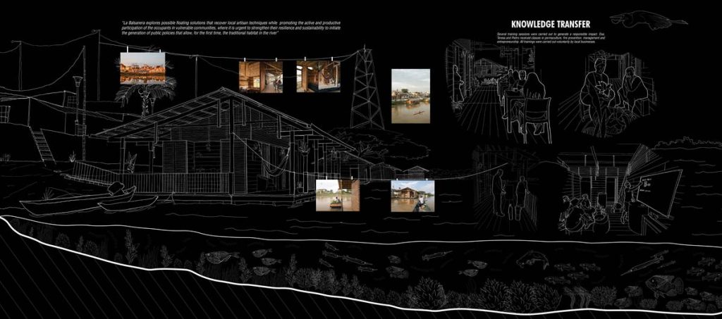 En Ecuador, las casas flotantes del río Babahoyo se constituyeron como uno de los principales puntos de acopio y descanso de la Colonia española en la ruta comercial de mercaderes entre las ciudades de Guayaquil y Quito. En la actualidad, el río ha dejado de ser una vía comercial fluvial lo que ha reducido el número de estructuras flotantes de 200 a 25, aumentando su riesgo de extinción, pese a ser reconocido como Bien Patrimonial Inmaterial del Ecuador. El SAT (Sharjah Architectural Triennial) convoca a equipos de arquitectura para desarrollar una exhibición que ponga en valor la importancia de la escasez, la reutilización de recursos y la valorización de técnicas ancestrales basadas en la naturaleza en el Sur Global, entre los que se encuentra el estudio Natura Futura, que en colaboración con Juan Carlos Bamba, plantean utilizar los recursos de la exposición -que comúnmente son empleados en construcciones efímeras y posteriormente desechadas- para construir la primera casa flotante sostenible en Babahoyo, Ecuador con el objetivo de recuperar la tradición de habitar en el río. La Balsanera explora soluciones flotantes que recuperen las técnicas artesanales locales mientras que se potencia la participación activa y productiva de los ocupantes en comunidades vulnerables, donde urge fortalecer su resiliencia y sostenibilidad para iniciar la generación de políticas públicas que permitan recuperar el hábitat tradicional en el río. El objetivo es plantear un modelo de vivienda flotante dirigida a Don Carlos, Doña Teresa y su hijo menor. Una familia que habita el río hace más de 30 años y que utiliza el ecosistema inmediato como su recurso principal. Carlos se dedica a la reparación de botes de madera, mientras que Teresa prepara comida tradicional, la cual es vendida a las comunidades locales. La vivienda en la que habitan presenta un estado crítico en su estructura y servicios básicos, impidiéndoles realizar sus actividades de sustento de forma digna y sostenible. El proyecto propone sistemas responsables con el medio ambiente como la utilización de un baño seco, filtros para la reutilización del agua del río, limpieza de desechos biológicos, energía solar y un huerto flotante para abastecer los recursos utilizados por Teresa en su cocina. El sistema constructivo se basó en el uso de madera local, como el laurel y la caña picada; mientras que el sistema de flotabilidad es fortalecido mediante estructuras híbridas de metal y plástico reciclado. Las piezas estructurales fueron pensadas de forma modular, lo que facilita su replicabilidad y transmisión de conocimientos entre los artesanos y los arquitectos. La distribución interna de la vivienda mantiene la configuración de la vivienda original, conservando el mono espacio interno de sala, comedor y cocina, y dos habitaciones. Se añadieron en los extremos laterales dos franjas: una productiva (taller de botes), y otra de servicio (baño seco, lavandería, inodoro y ducha). La plataforma remata hacia el río con una terraza productiva donde se genera la posibilidad de extender el servicio de alimentos tradicionales, encuentro social, y anclaje de botes turísticos.