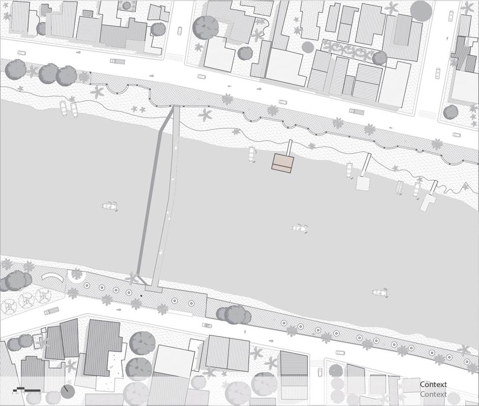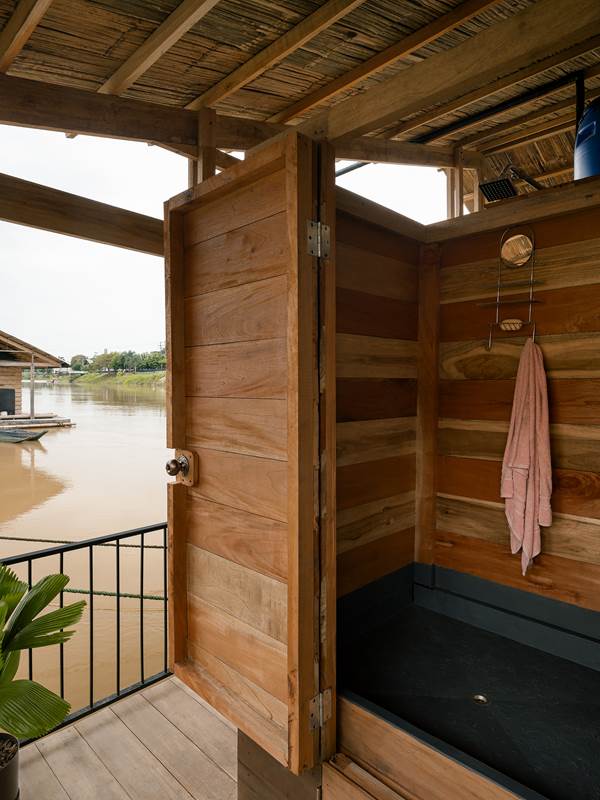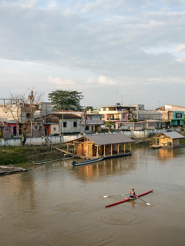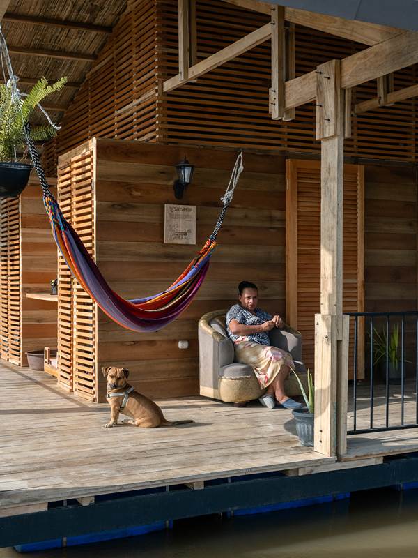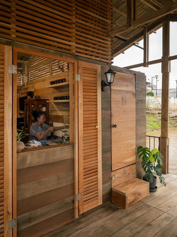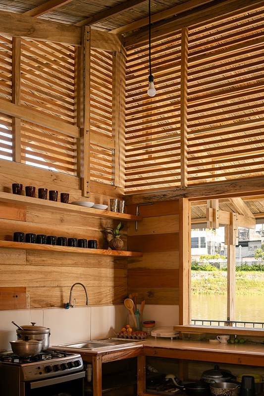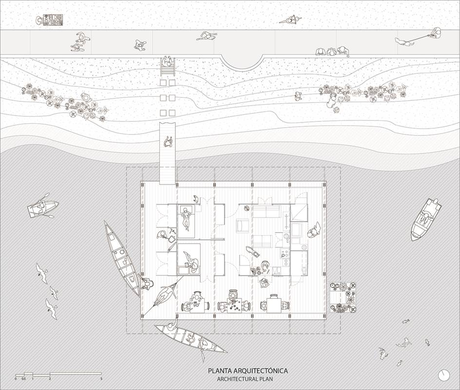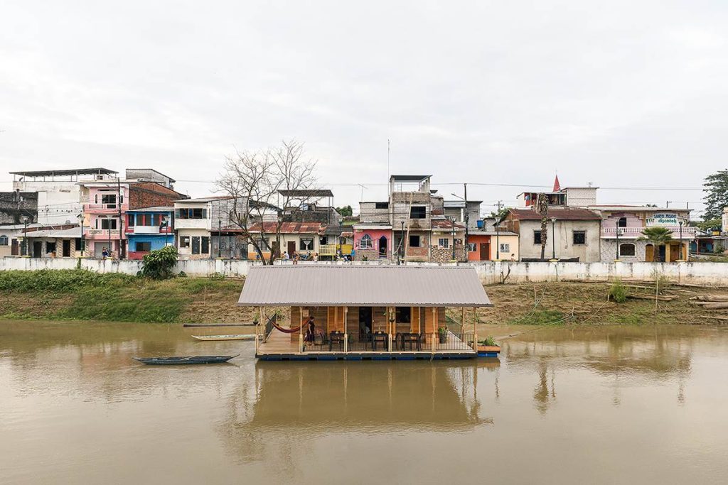 En Ecuador, las casas flotantes del río Babahoyo se constituyeron como uno de los principales puntos de acopio y descanso de la Colonia española en la ruta comercial de mercaderes entre las ciudades de Guayaquil y Quito. En la actualidad, el río ha dejado de ser una vía comercial fluvial lo que ha reducido el número de estructuras flotantes de 200 a 25, aumentando su riesgo de extinción, pese a ser reconocido como Bien Patrimonial Inmaterial del Ecuador. El SAT (Sharjah Architectural Triennial) convoca a equipos de arquitectura para desarrollar una exhibición que ponga en valor la importancia de la escasez, la reutilización de recursos y la valorización de técnicas ancestrales basadas en la naturaleza en el Sur Global, entre los que se encuentra el estudio Natura Futura, que en colaboración con Juan Carlos Bamba, plantean utilizar los recursos de la exposición -que comúnmente son empleados en construcciones efímeras y posteriormente desechadas- para construir la primera casa flotante sostenible en Babahoyo, Ecuador con el objetivo de recuperar la tradición de habitar en el río. La Balsanera explora soluciones flotantes que recuperen las técnicas artesanales locales mientras que se potencia la participación activa y productiva de los ocupantes en comunidades vulnerables, donde urge fortalecer su resiliencia y sostenibilidad para iniciar la generación de políticas públicas que permitan recuperar el hábitat tradicional en el río. El objetivo es plantear un modelo de vivienda flotante dirigida a Don Carlos, Doña Teresa y su hijo menor. Una familia que habita el río hace más de 30 años y que utiliza el ecosistema inmediato como su recurso principal. Carlos se dedica a la reparación de botes de madera, mientras que Teresa prepara comida tradicional, la cual es vendida a las comunidades locales. La vivienda en la que habitan presenta un estado crítico en su estructura y servicios básicos, impidiéndoles realizar sus actividades de sustento de forma digna y sostenible. El proyecto propone sistemas responsables con el medio ambiente como la utilización de un baño seco, filtros para la reutilización del agua del río, limpieza de desechos biológicos, energía solar y un huerto flotante para abastecer los recursos utilizados por Teresa en su cocina. El sistema constructivo se basó en el uso de madera local, como el laurel y la caña picada; mientras que el sistema de flotabilidad es fortalecido mediante estructuras híbridas de metal y plástico reciclado. Las piezas estructurales fueron pensadas de forma modular, lo que facilita su replicabilidad y transmisión de conocimientos entre los artesanos y los arquitectos. La distribución interna de la vivienda mantiene la configuración de la vivienda original, conservando el mono espacio interno de sala, comedor y cocina, y dos habitaciones. Se añadieron en los extremos laterales dos franjas: una productiva (taller de botes), y otra de servicio (baño seco, lavandería, inodoro y ducha). La plataforma remata hacia el río con una terraza productiva donde se genera la posibilidad de extender el servicio de alimentos tradicionales, encuentro social, y anclaje de botes turísticos.