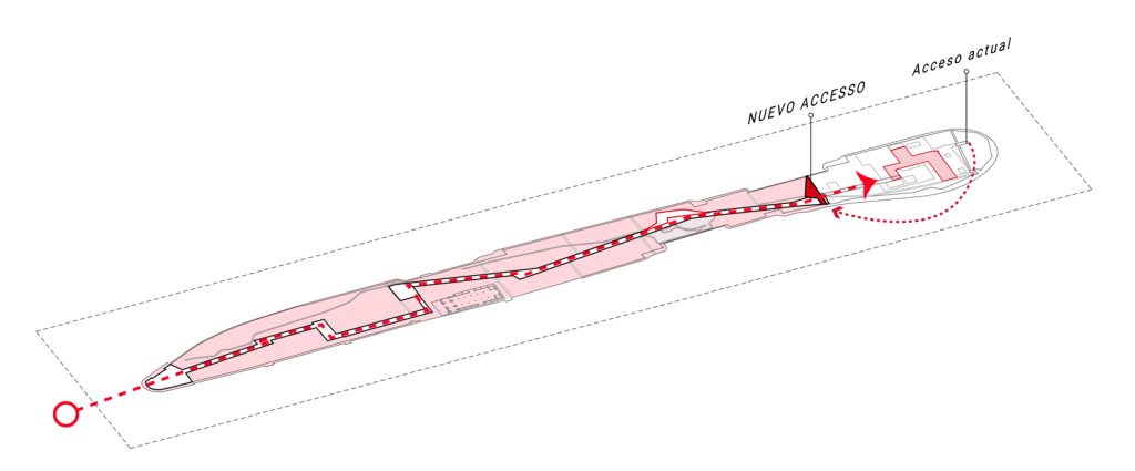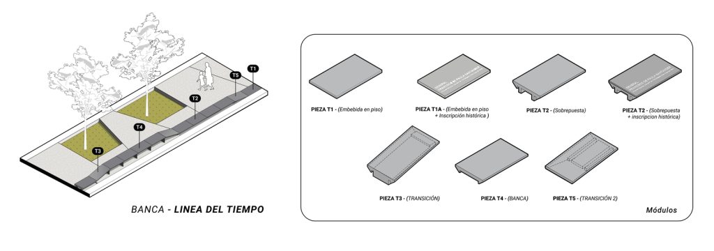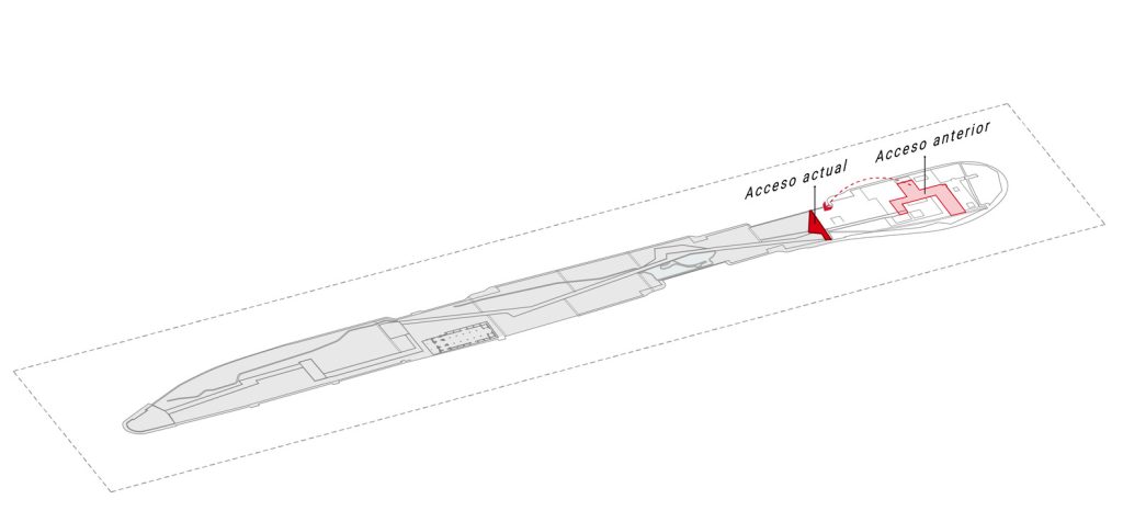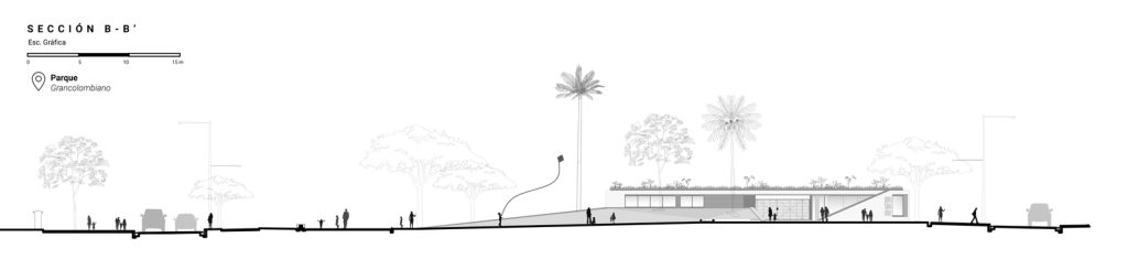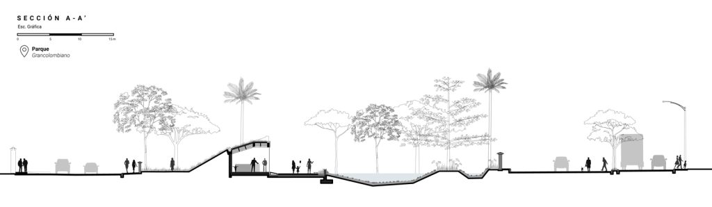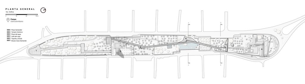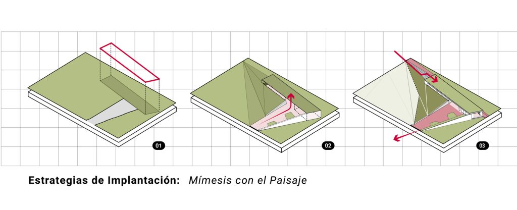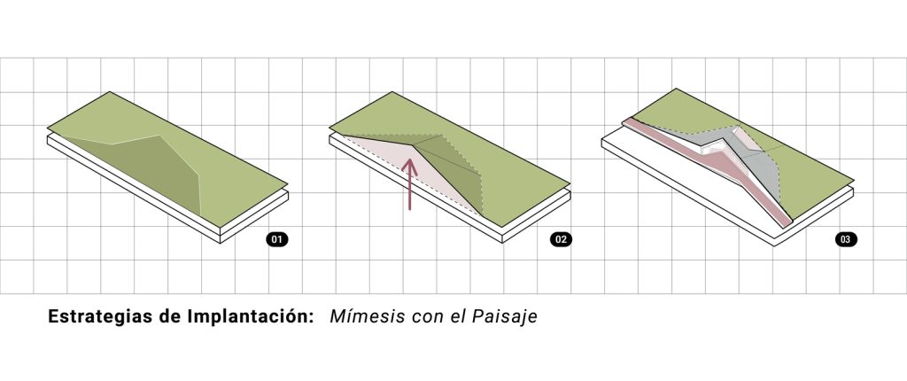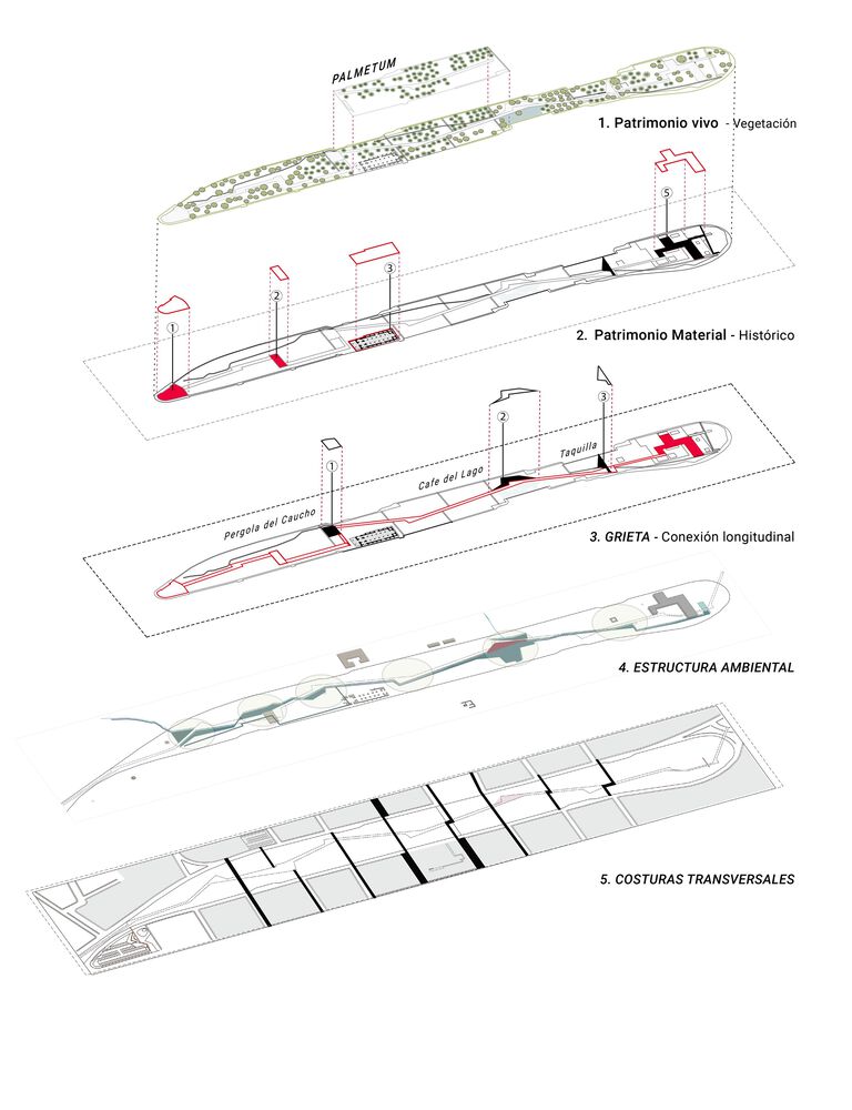 Para reconectar el conjunto patrimonial, se propone una estructura longitudinal (Grieta) y de una serie de estructuras transversales (Tejidos), estas dos estructuras organizan los usos del parque, su composición y reconocen formas de conexión a distintas escalas
