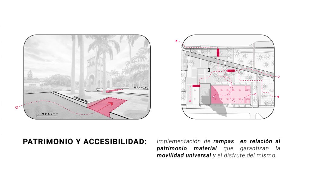 - Promover la accesibilidad al patrimonio: Se busca recuperar físicamente los BIC a partir de su restauración, al tiempo que busca resignificarlos, a través de reorganizar los recorridos del parque, combinando los itinerarios peatonales, con la inclusión de pequeñas infraestructuras de bajo impacto, de carácter mimético, que utilizan distintas estrategias para articularse de manera respetuosa al conjunto.