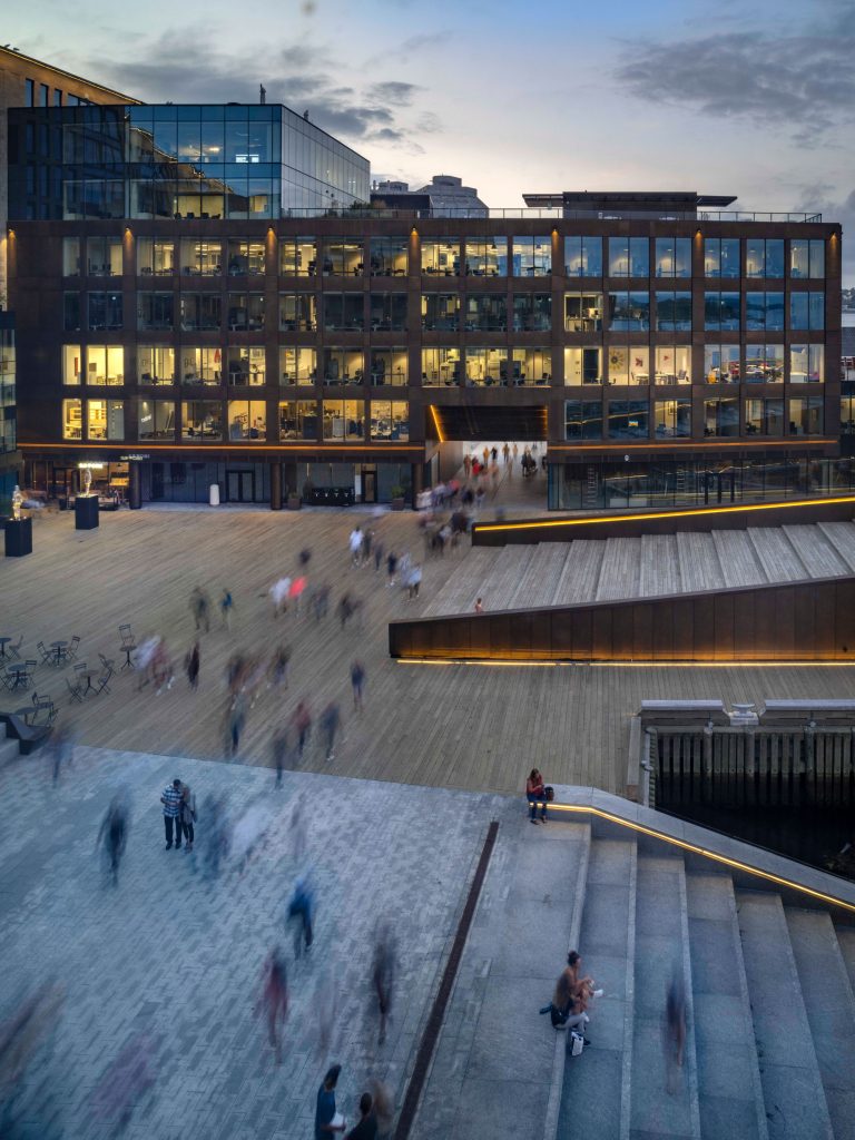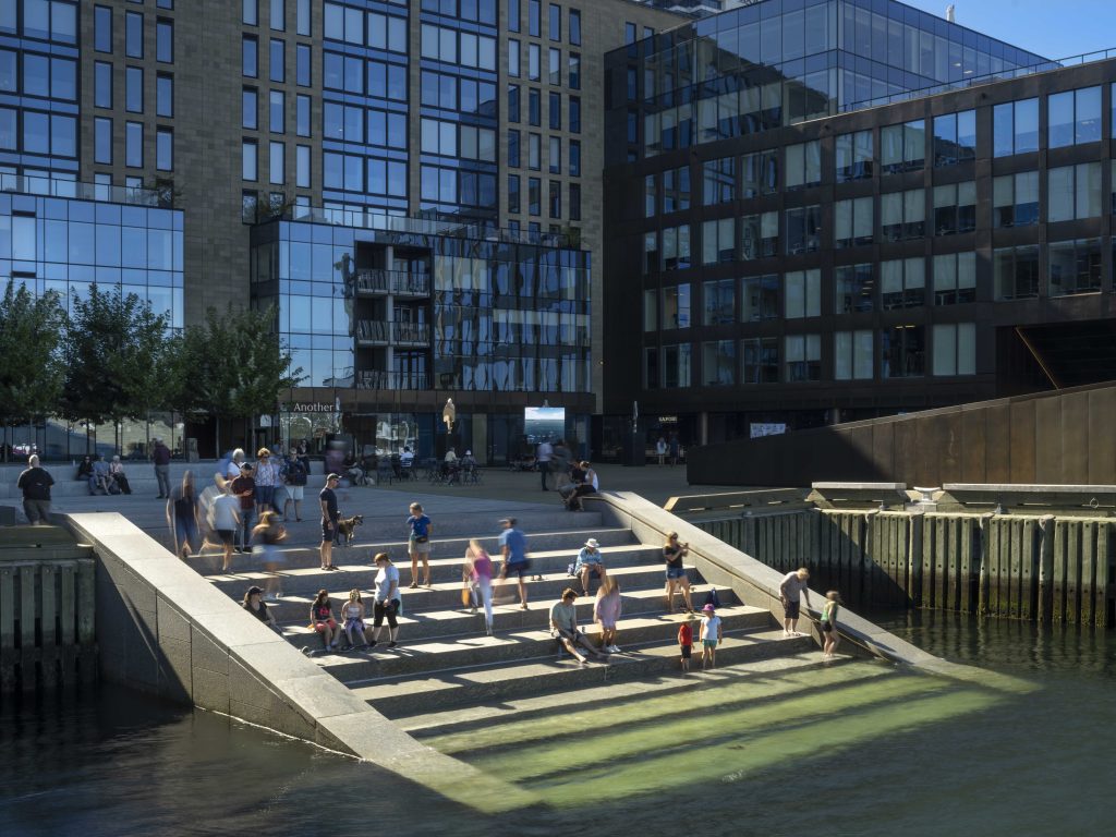 El diseño abre el 70 % del sitio al espacio público e incluye el primer espacio de reunión pública significativo de la ciudad frente al puerto. Múltiples pasajes a través de los edificios hacen que el desarrollo sea altamente poroso para el público, incluyendo un acceso directo al agua mediante una escalera ribereña.