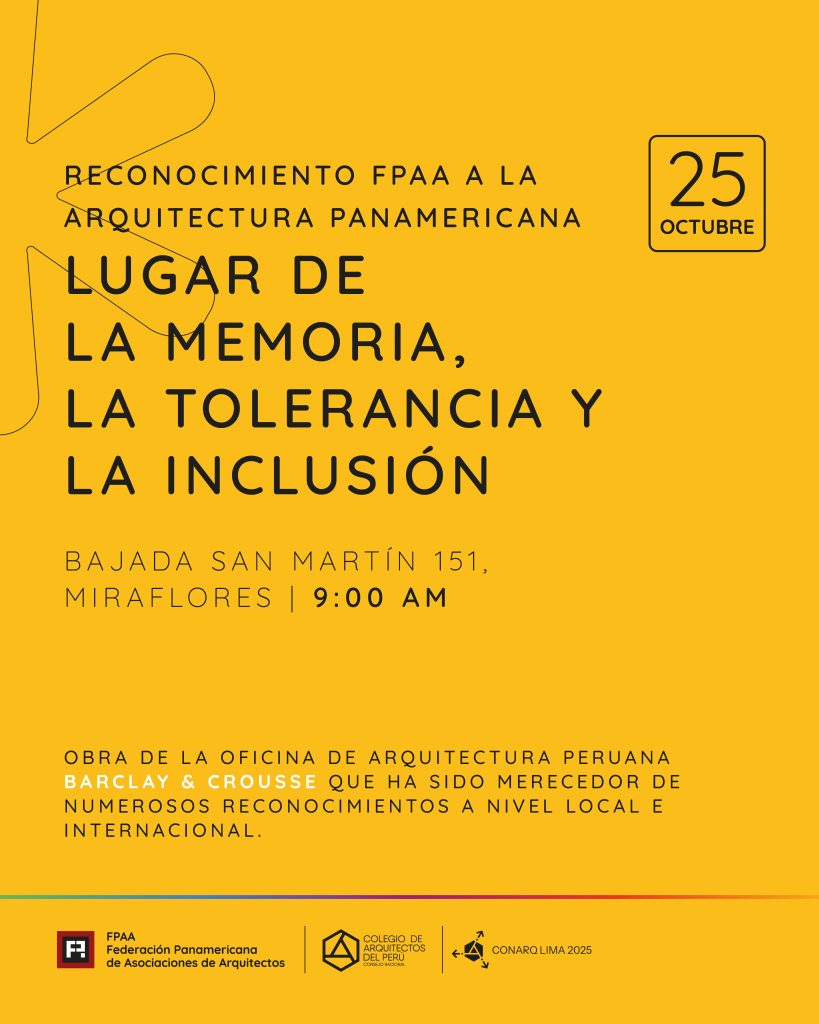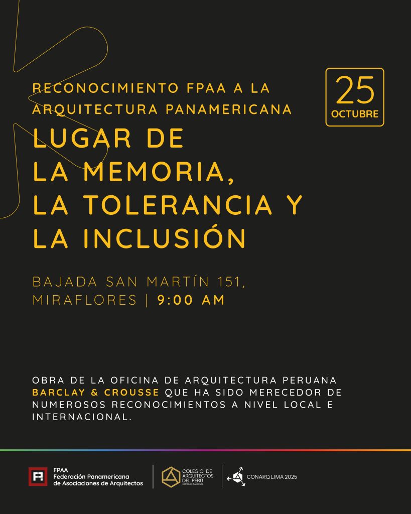 En esta edición, el sábado 25 de octubre de 2025, la FPAA otorgará la placa de reconocimiento al edificio Lugar de la Memoria, la Tolerancia y la Inclusión Social (LUM), obra del estudio peruano Barclay & Crousse Arquitectos, reconocido internacionalmente por su compromiso con la arquitectura pública y la memoria colectiva.